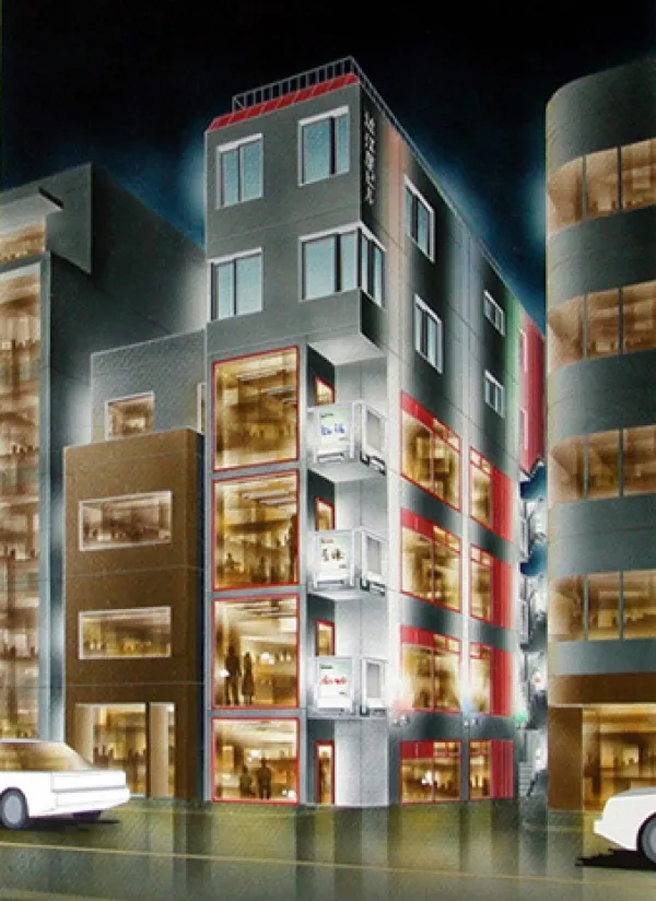 SRC造の地下2階・地上7階建て複合ビル(店舗、事務所、住宅)の設計。延べ面積約8,100平方メートル。