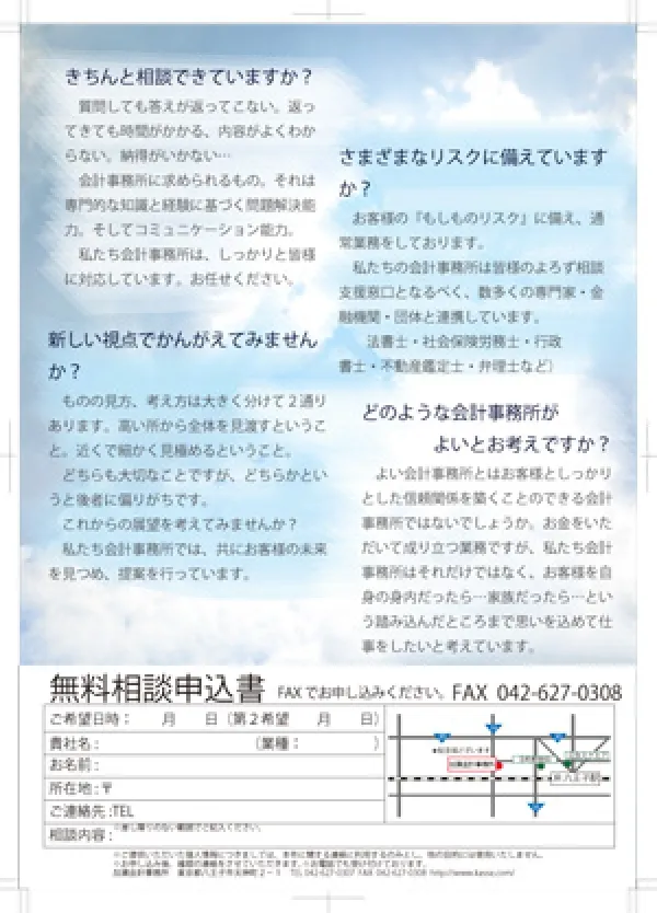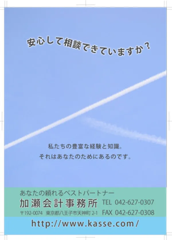『人』という字に似た飛行機雲を撮って人のつながりを大切にする会計事務所を印象づけました。