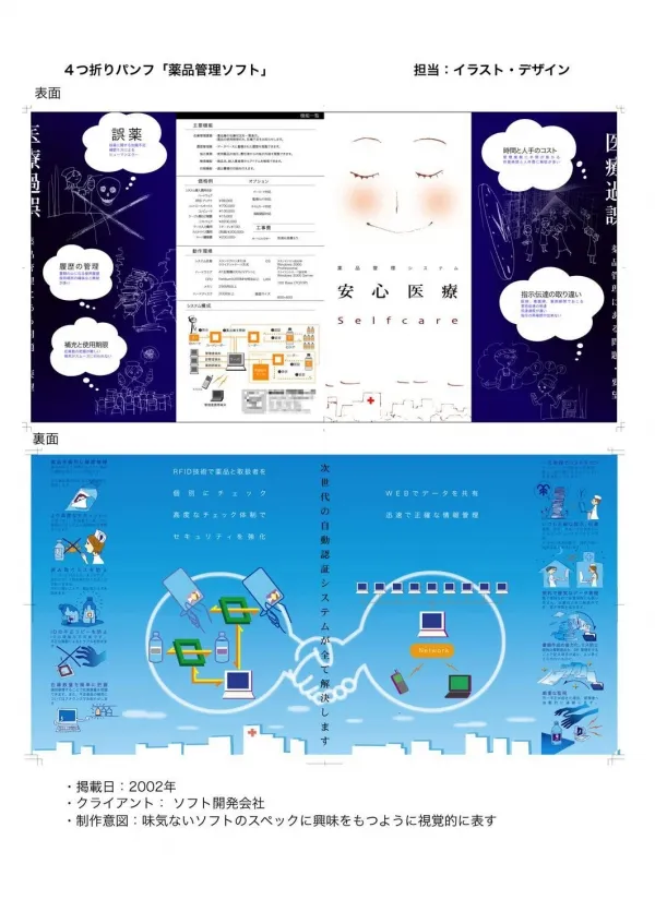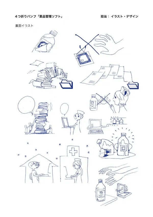 4つ折りパンフ「薬品管理ソフト」表面イラスト