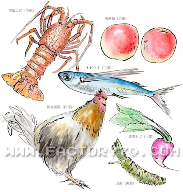 食生活・食文化の研究者、下村尚子氏の著書「食の力-豊かな心を育てるための食育論」の挿絵を担当させて頂きました。日本の各地方固有の食材を紹介するページのイラストを6地方に各12点ずつ制作しました。