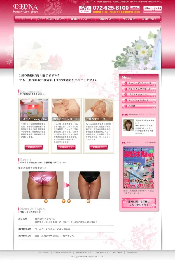 デザイン、コーディング(xhtml+css)を請け負いました。 美容系のサイトなので、華やかな雰囲気が出せるようにデザインしました。 お客さまに気に入っていただき、1回の提出でOKを出してもらえました。