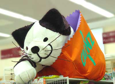ホームセンター:大きなネコぬいぐるみが棚上からお出迎え ..