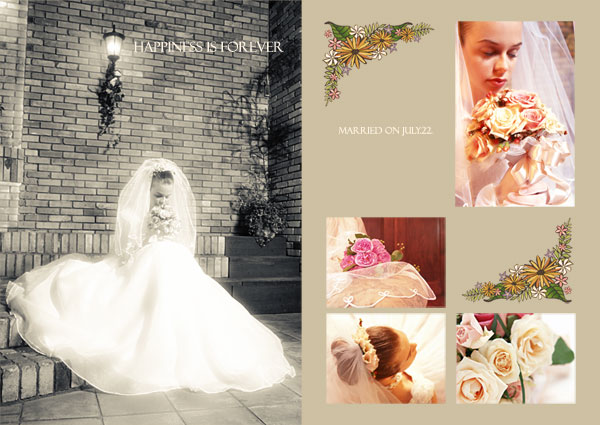 ブライダルフォトにいろいろな編集を加えデジタルアルバムを製作いたしました。個々のお客様の要望を直接伺い希望に沿ったデザインを施しております。