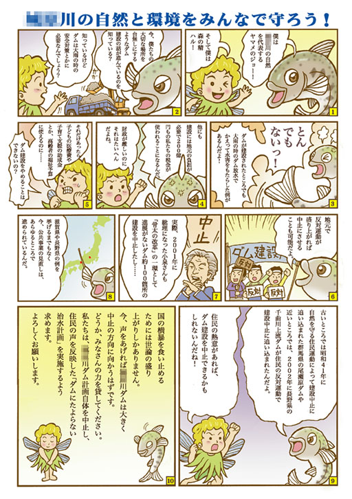 某川に建設予定のダムに対する反対運動を訴えるチラシに掲載したマンガです。