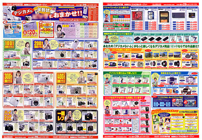 B3サイズの表裏にデジカメと関連商品すべてを載せたチラシです。たくさんの商品があるので、なるべく見やすくしかも楽しさを感じるように考えました。