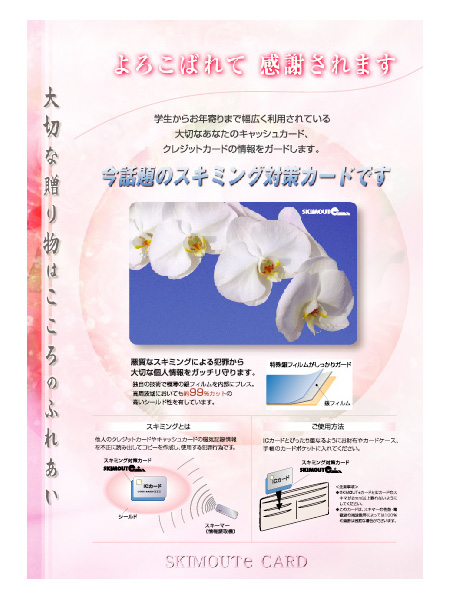 スキミング犯罪からICカードを守るカードのチラシですが、ギフトやノベルティとして扱ってもらえるように、贈り物のイメージにしてほしいという依頼でした。全体に優しい色合いにして、中心のカードのまわりを丸く画像で区切りなんとなく保護しているような雰囲気を出そうと考えました。