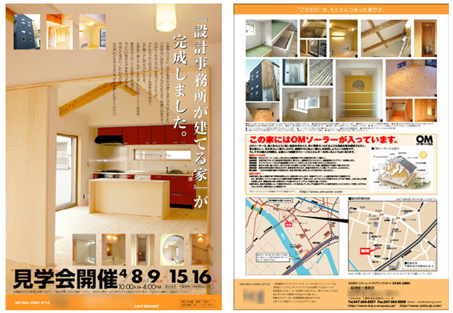 自然素材を多用したハイセンスな注文住宅の完成見学会のチラシです。素材や空調がエコな住みやすいお家で、ぜひたくさんの人に見てもらいたいと思っていました。予想以上の方が見学に来てくださいました。