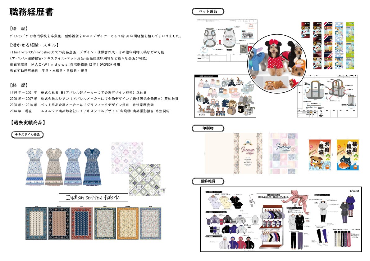 アパレル商品・ペット用品・テキスタイル・印刷商品(DTP)その他、様々なデザインを手掛けてまいりました。
