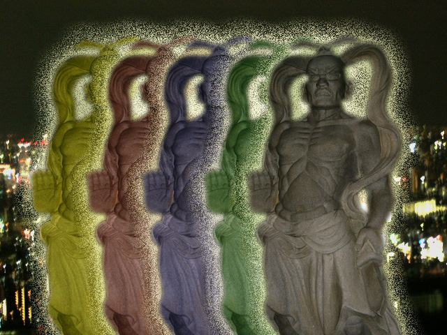 仁王様は夜見ると、すごい迫力があります。この作品ではカラフルな仁王像を並べましたが、都会の人の心に住む仁王像…というイメージで作成してみました。。。 ..