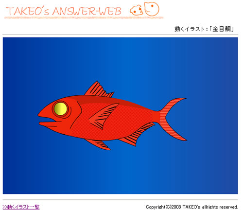 泳ぐ金目鯛のFLASHです。それぞれのパーツを動かす事で、泳ぎを表現しました。ところで、何で金目鯛の煮付けって、あんなに美味しいんですかね。。。 ..